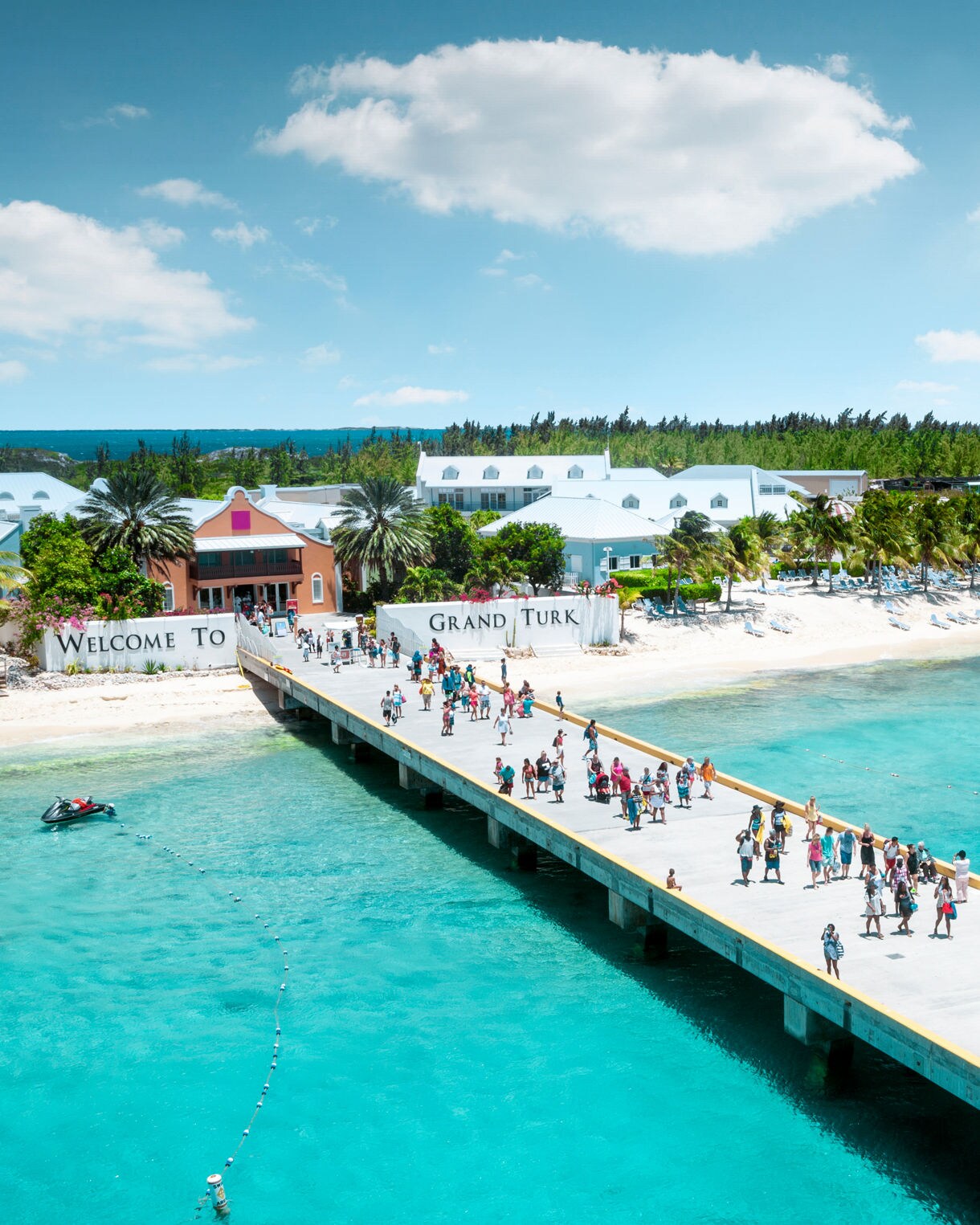 A pier extending into turquoise waters with tourists walking toward the colorful waterfront buildings and green hills of Ocho Rios.