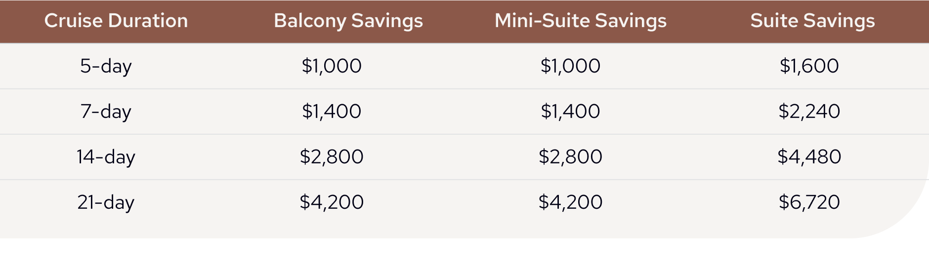 When you book a Sanctuary Suite, Sanctuary Mini-Suite or Sanctuary Balcony, you’ll access an entirely new world of bespoke amenities, private spaces and premium service – the very best of all we have to offer. Our “ship within a ship” experience provides the exclusivity sought by those who expect the finest in travel. For a limited time, save $1,400 or more when you book a Sanctuary Collection stateroom. Don’t let these savings sail away.