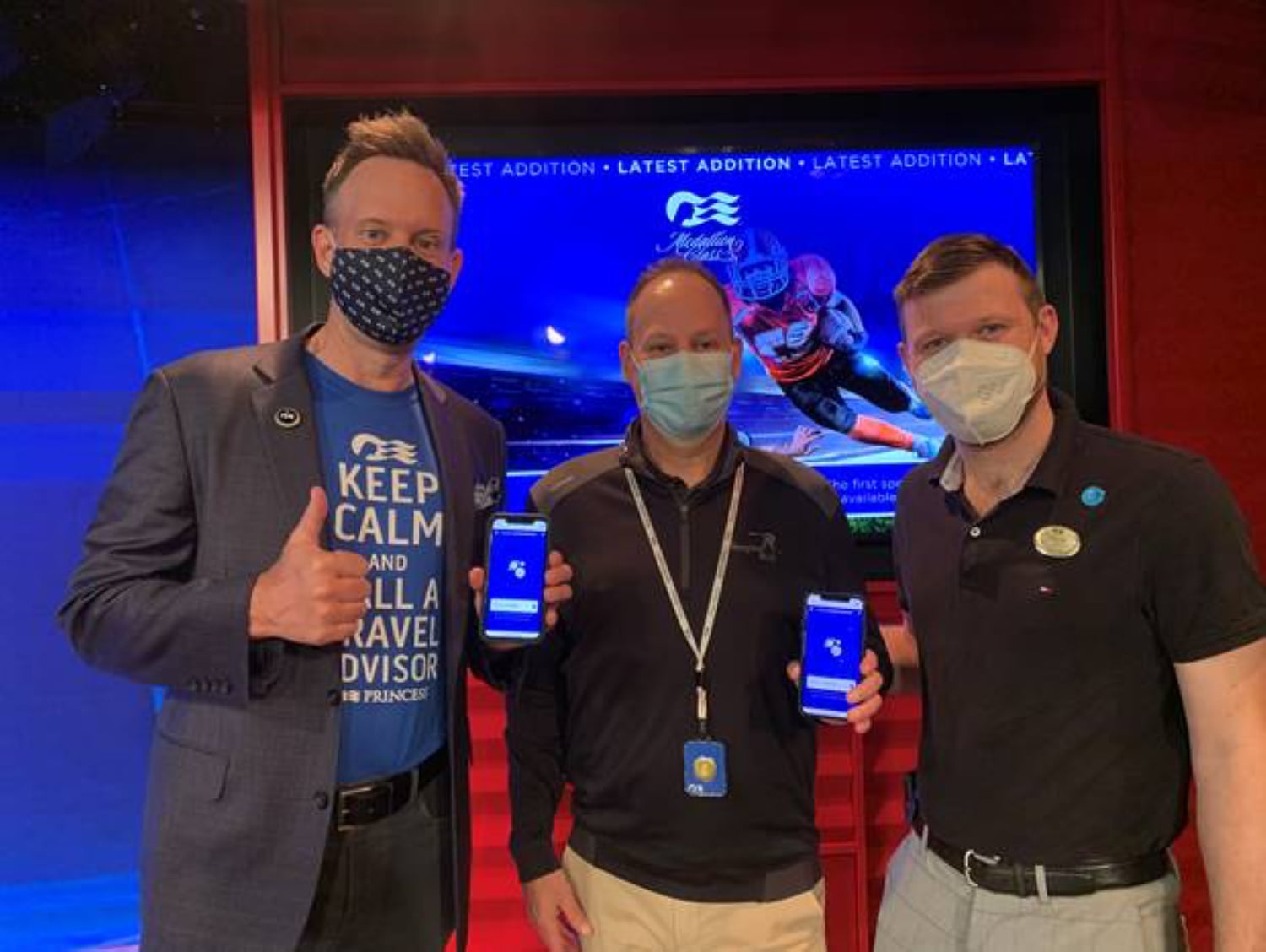 Majestic Princess guest Mark Wilson, vice president of product strategy for Cruise & Tour for Arrivia (center), was the first guest on Majestic Princess to place a bet at sea using the new Ocean Sportsbook real-time sports wagering experience, available through the Ocean Sportsbook, part of the Princess MedallionClass experience. John Chernesky, senior vice president, North America sales & trade marketing for Princess (left) and Kevin Tugwell, Majestic Princess cruise director (right) joined Wilson to mark the occasion.