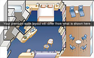 Premium accommodations and luxurious appointments are the signature of our expansive 440 to 682 square feet Suites. Your Suite includes a spacious cabin and large 83-338 square foot balcony, with exclusive Suite-only benefits plus the incredible perks of Club Class. Suites feature a separate seating area with a sofabed, spacious closet, full bathroom and deluxe amenities.