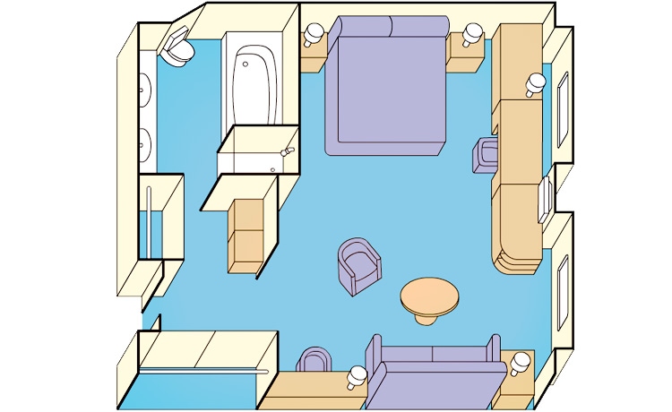 Our Window Suites feature all of the same great amenities of our regular Suites, but include window views in lieu of a balcony in this expansive 319 to 341-square-foot stateroom. Suites feature a separate seating area with a sofabed, walk-in closet, full bathroom and deluxe amenities.