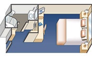 *Photos, floor plan diagrams and amenities represent typical arrangements and may vary by ship. Certain stateroom categories may vary in size, decor and configuration by ship. Stateroom views are considered unobstructed unless noted otherwise. Some categories have portholes versus picture windows. Some staterooms are partially to fully obstructed, as shown on deck plans. Obstructions do not include certain nautical items like handrails, dividers or ship hardware. For balcony staterooms, the view is determined from the perspective of the balcony railing. Balconies may have either solid steel or toughened glass railings. Upper berth and bed ladder capacities are 250 lbs. Staterooms that can accommodate rollaways have two lower berths and one upper berth, and the staterooms can accommodate a fourth berth as a rollaway bed upon request at time of reservation. There are a limited number of rollaway beds per ship, per voyage. Use of rollaway beds restricts cabin space. Contact Princess Cruises for more information.