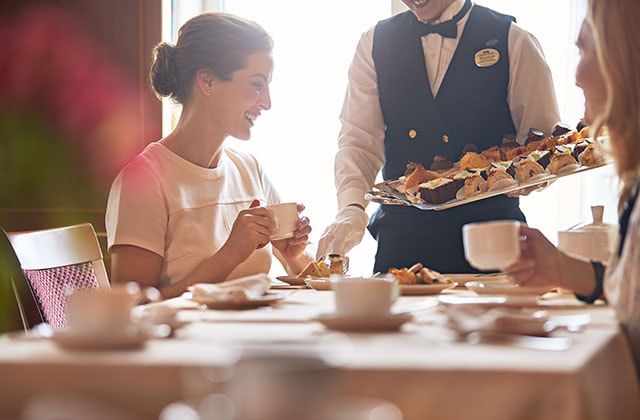 Indulge in a traditional afternoon tea service, served on board daily, complete with tea sandwiches, cookies, scones and the classic hearty jams and rich, creamy spreads. Choose from a selection of flavorful teas and relax in an elegant dining room.