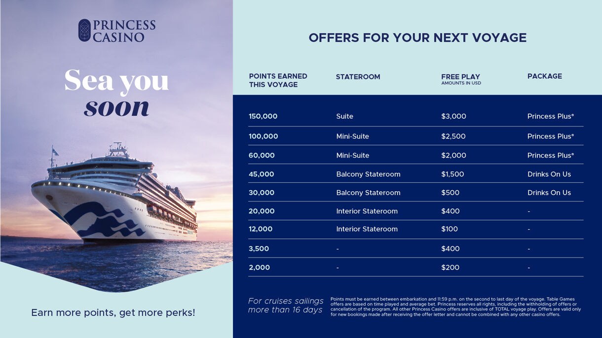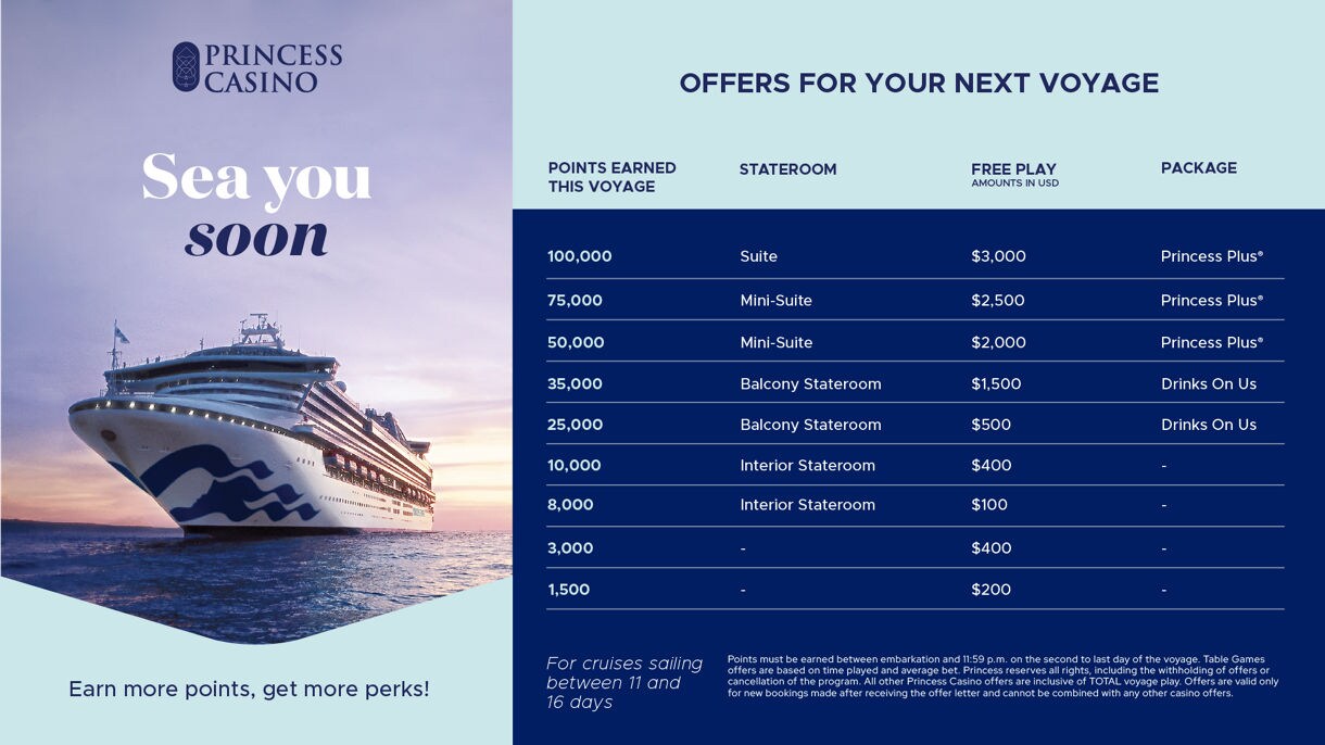 With our Sea You Soon casino offer, your play does not just elevate your onboard experience—it unlocks future voyages filled with the same excitement, rewards, and unforgettable moments. Discover how you can qualify, where you can sail next, and how easy it is to redeem your exclusive offer. Whether you’re earning an offer for the first time or a Princess enthusiast, your next adventure is already on the horizon.